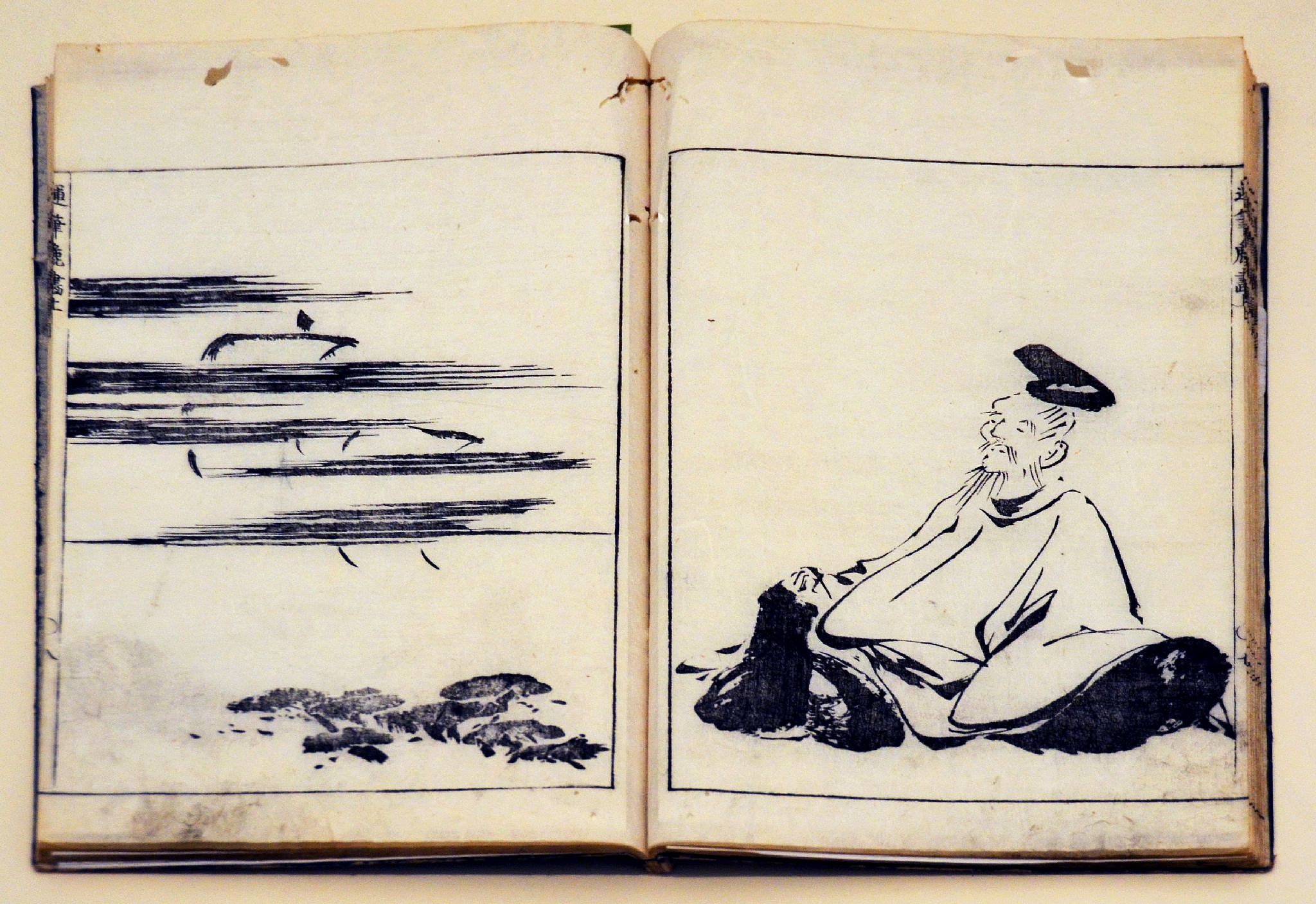 3 volumes complete. A book dealing with So (cursive or coarse brushwork), and introducing, if not for the first time, then for the first time on such a systematic scale, new methods in preparing woodblocks to convey total effects on ink-painting, not by black outlines or by lines in white reserve, but by roughening the surface of the wood to produce a scumbling, almost mezzotint-like effect, and by lowering certain areas, which then painted more faintly than the remainder of the block with the connivance, of course, of the printer, who was responsible for the degree of pressure applied to the barren used for “burnishing off†the proof. Jack Hillier, “Art of the Japanese Book†(1987), pg. 191.