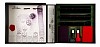 12 rubber stamps, red and black ink pads, 2 bottles of ink, original stamp drawing on lid; wooden compartments inside, painted green; 3 sheets of instructions; in black linen covered box.