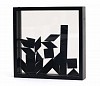 Using a series of three related and repeated three-dimensional elements of squares, triangles and rhombi with equal bases inside a square space with one rectangular bar, Enzo Mari produces a natural phenomena engaging the viewer's participation. The rotation of the square produces nearly infinite combinations as the pieces fall into place.