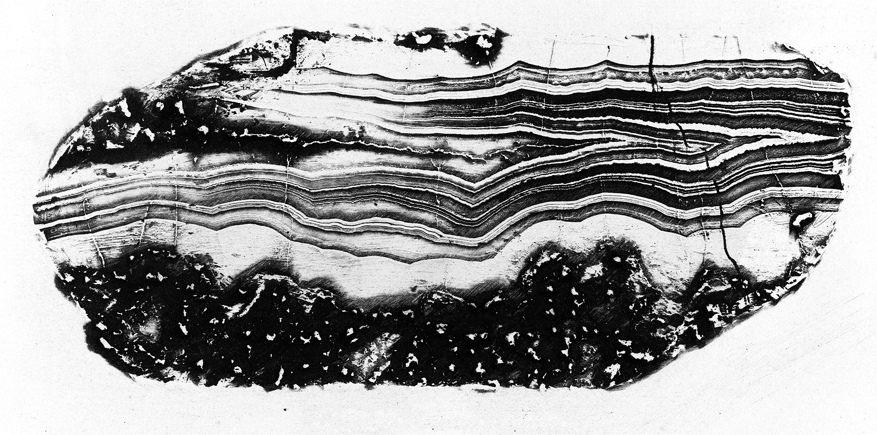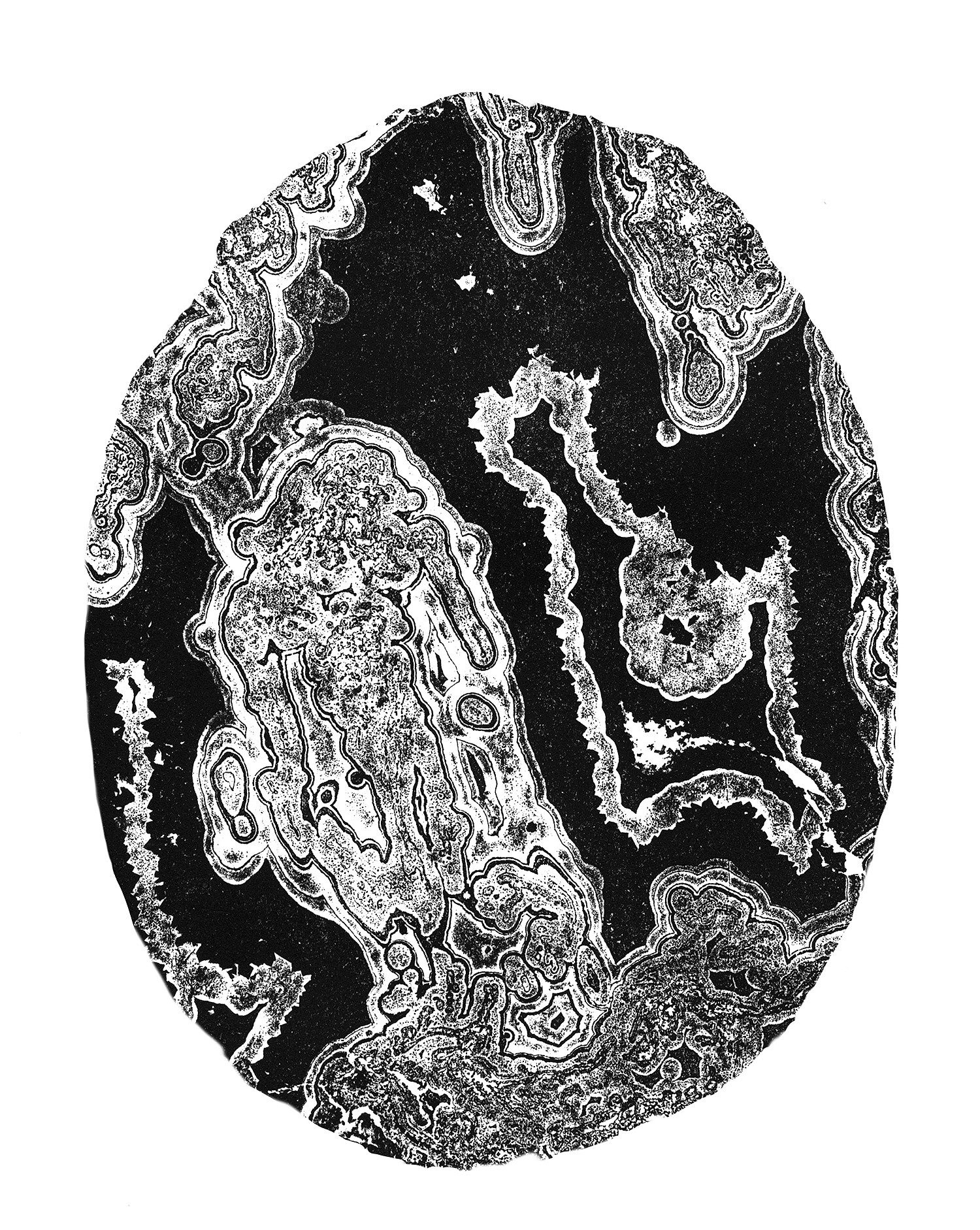 Inspired by the nature printing intaglio technique invented in 1851 by Dr. Franz Leydolt in Vienna. The Agate is etched with Hydrochloric Acid and put in an electrically charged bath to create a copper printing plate that is used to create an image of impeccable exactitude. This 19th century technique was also used on meteorites, bats, snakes, fossils, flies, lace, flowers, and leaves.